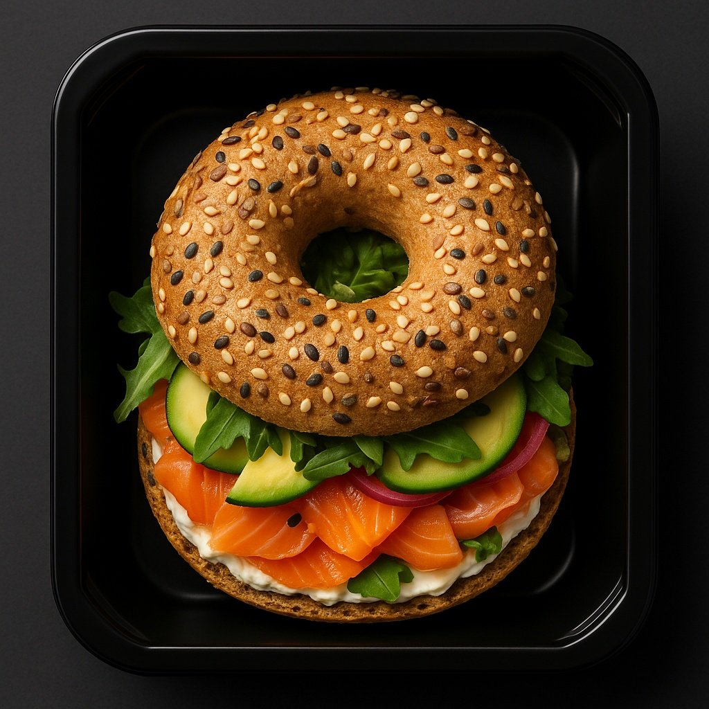Składniki: bajgiel z ziarnami, łosoś wędzony, awokado, rukola, ogórek, serek śmietankowy