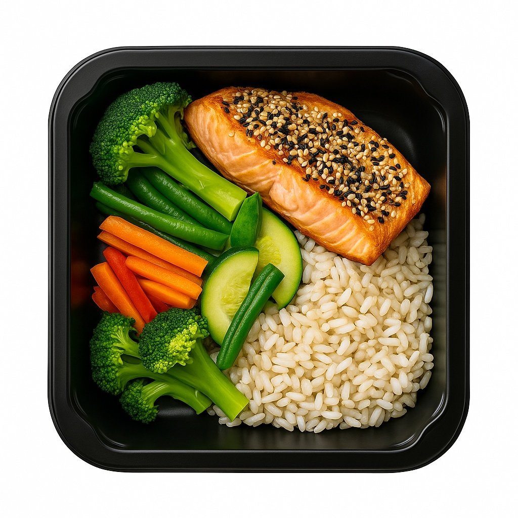 Z ryżem i pieczonym łososiem w sezamie