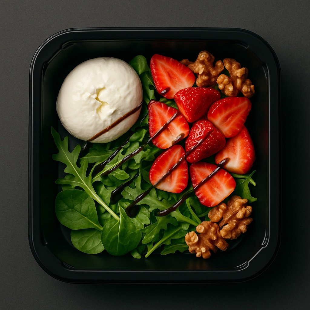 Składniki: burrata, truskawki, orzechy włoskie, rukola, roszponka, szpinak, krem balsamiczny