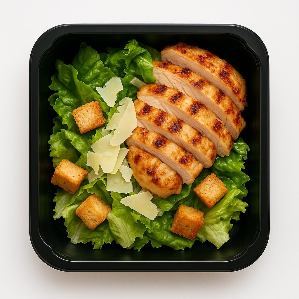 Składniki: sałata rzymska, grillowana pierś z kurczaka, grzanki, parmezan, sos Cezar