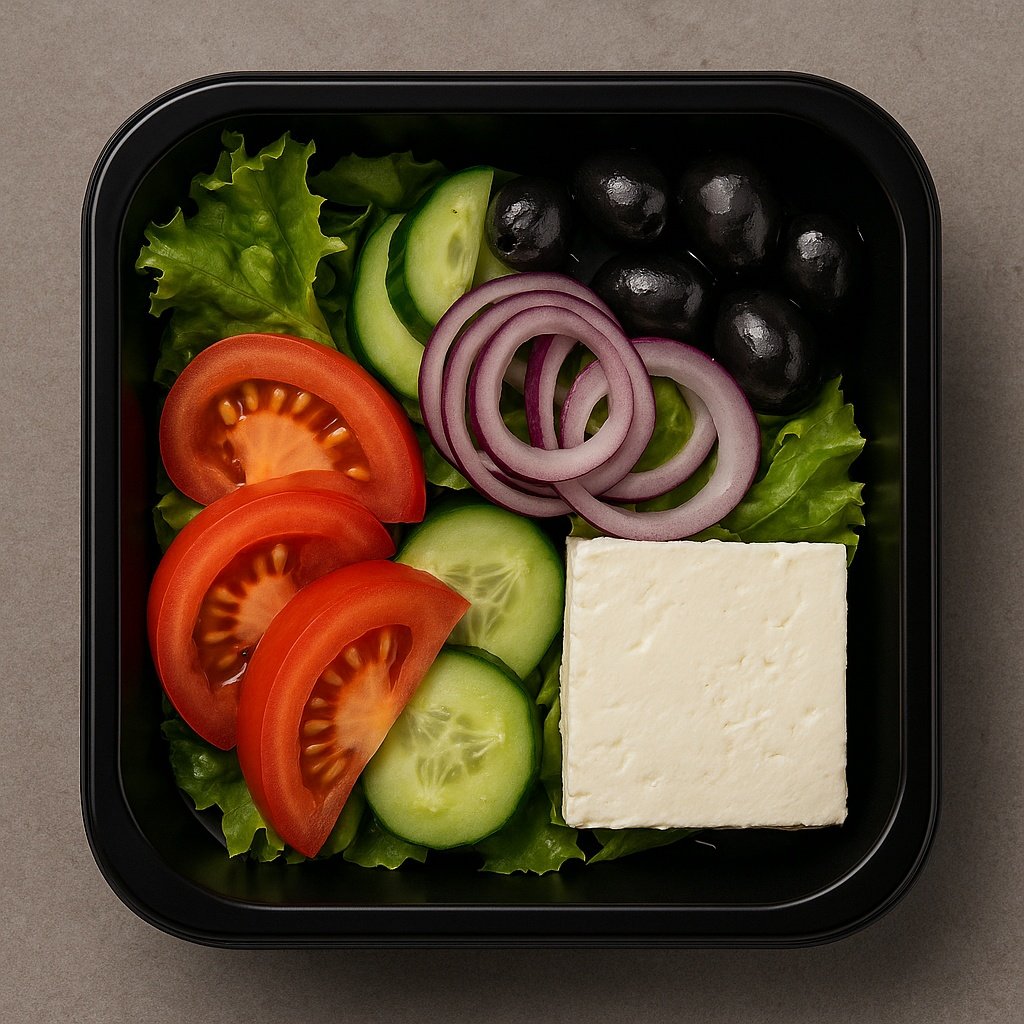 Składniki: mix sałat, pomidor, ogórek, czerwona cebula, oliwki, ser feta, oliwa