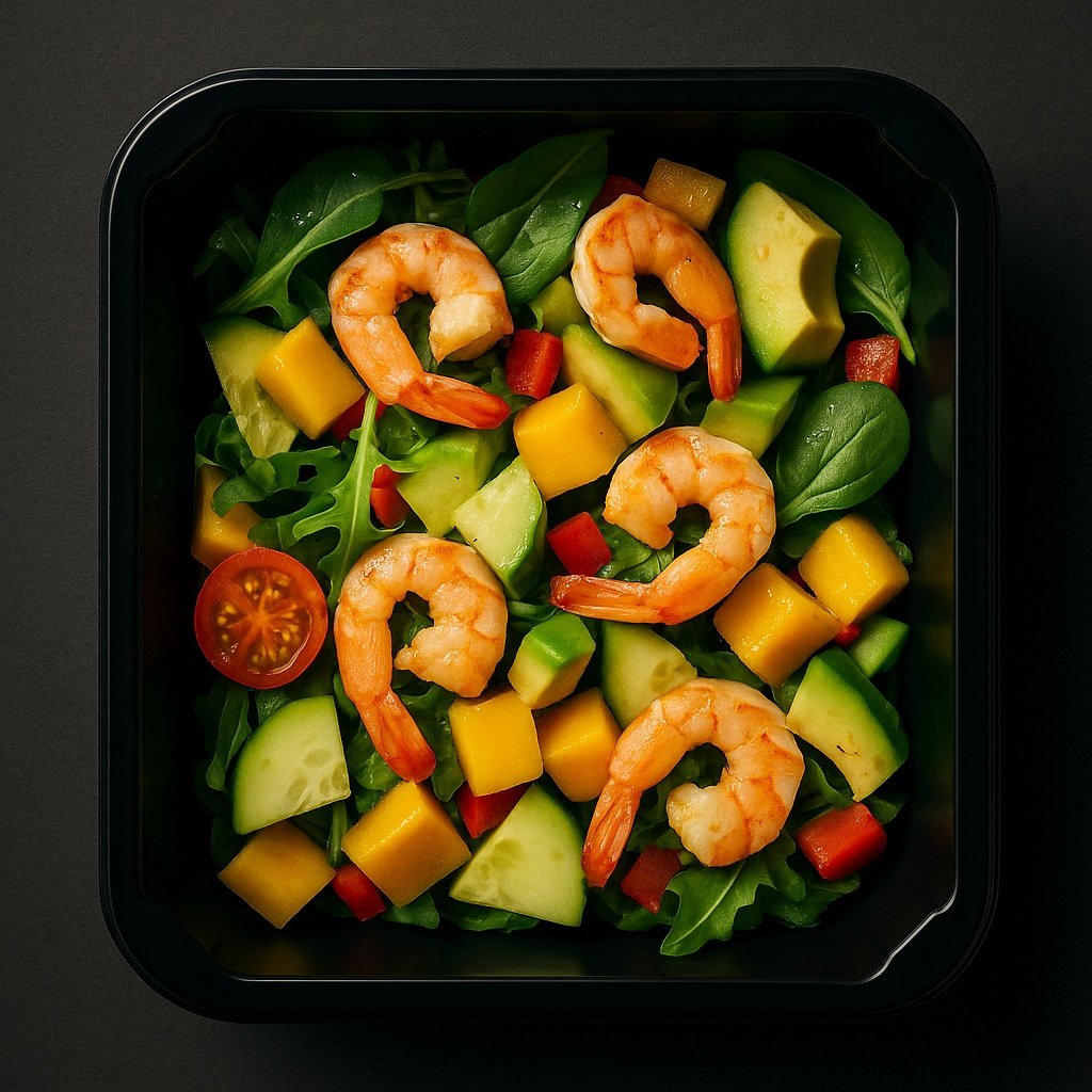 Składniki: mix sałat, krewetki, awokado, mango, pomidorki koktajlowe, ogórek, sos winegret